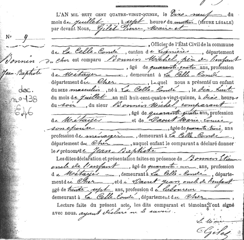 Jean-Baptiste, né à La Celle-Condé, dans le Cher, le 18 juillet 1895, est le fils de Michel Bonnin et Marguerite Daoût, et le frère de mon arrière grand-mère Marguerite alias "guiguite"