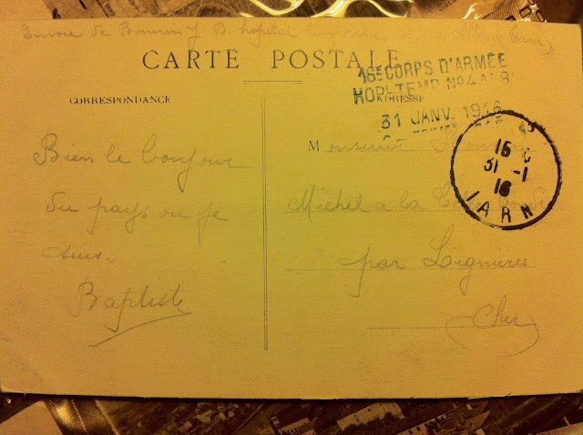 RépondreSupprimerA y regarder de plus près, l'écriture de la 2e carte est différente des autres (notamment, le "d" n'a pas cette forme particulière qu'il a dans la 1re et la 3e). Peut-être dictée à quelqu'un ? Enfin bon, il faudrait voir par rapport à l'ensemble de ces cartes. Qu'en pensez-vous ?