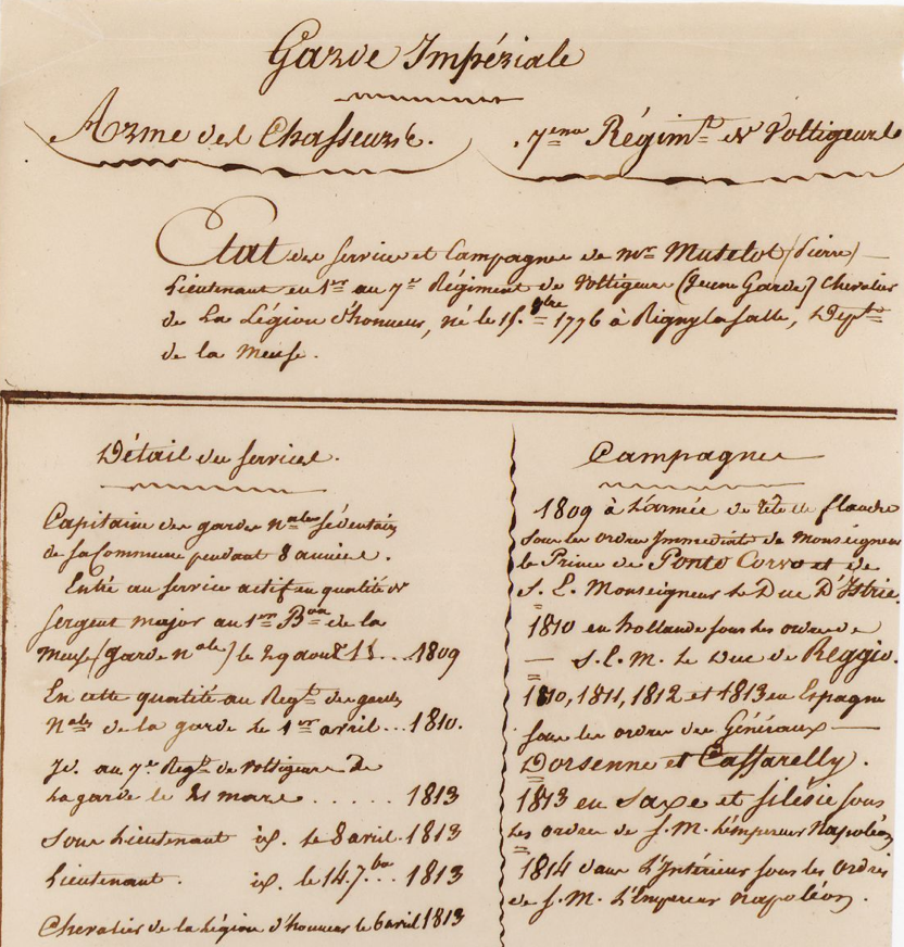 Cet aïeul, qui a finit en 1813 lieutenant du 7ème régiment des voltigeurs de la garde, a reçu la légion d'honneur en 1817 pour tous les services rendus pendant la période napoléonienne.