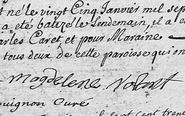 Le 26 janvier 1733, dans la paroisse vosgienne de Crainvilliers, mon ancêtre Madeleine ROLLAND a l'honneur de signer l'acte de baptême d'une enfant née la veille, non avec la qualité de mère, mais avec celle de marraine.