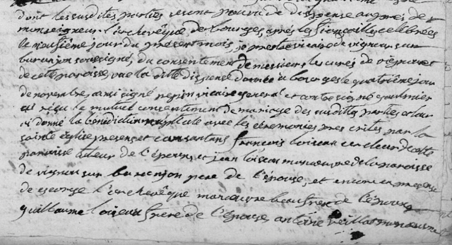 C'est dans cette paroisse que le 11 novembre 1766 mes aïeux, Pierre LOISEAU et Blondine LOISEAU se sont mariés devant le mestre vicaire Foucher de Vignoux-sur-Barangeon, assez loquace pour un vicaire berrichon.