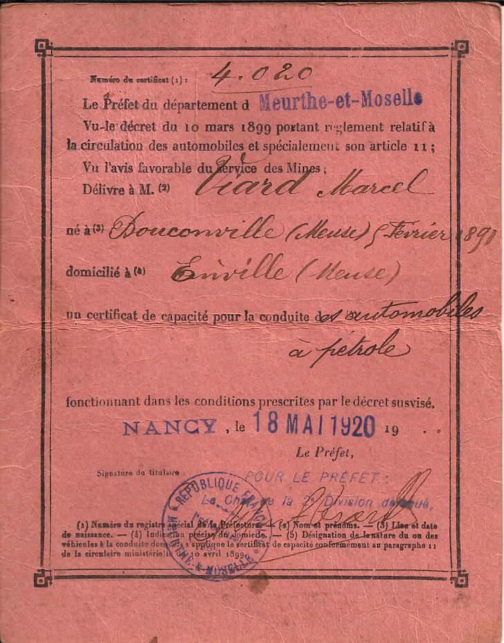 Ce permis appelé auparavant "certificat de capacité" lui a été délivré en 1920 à Nancy.