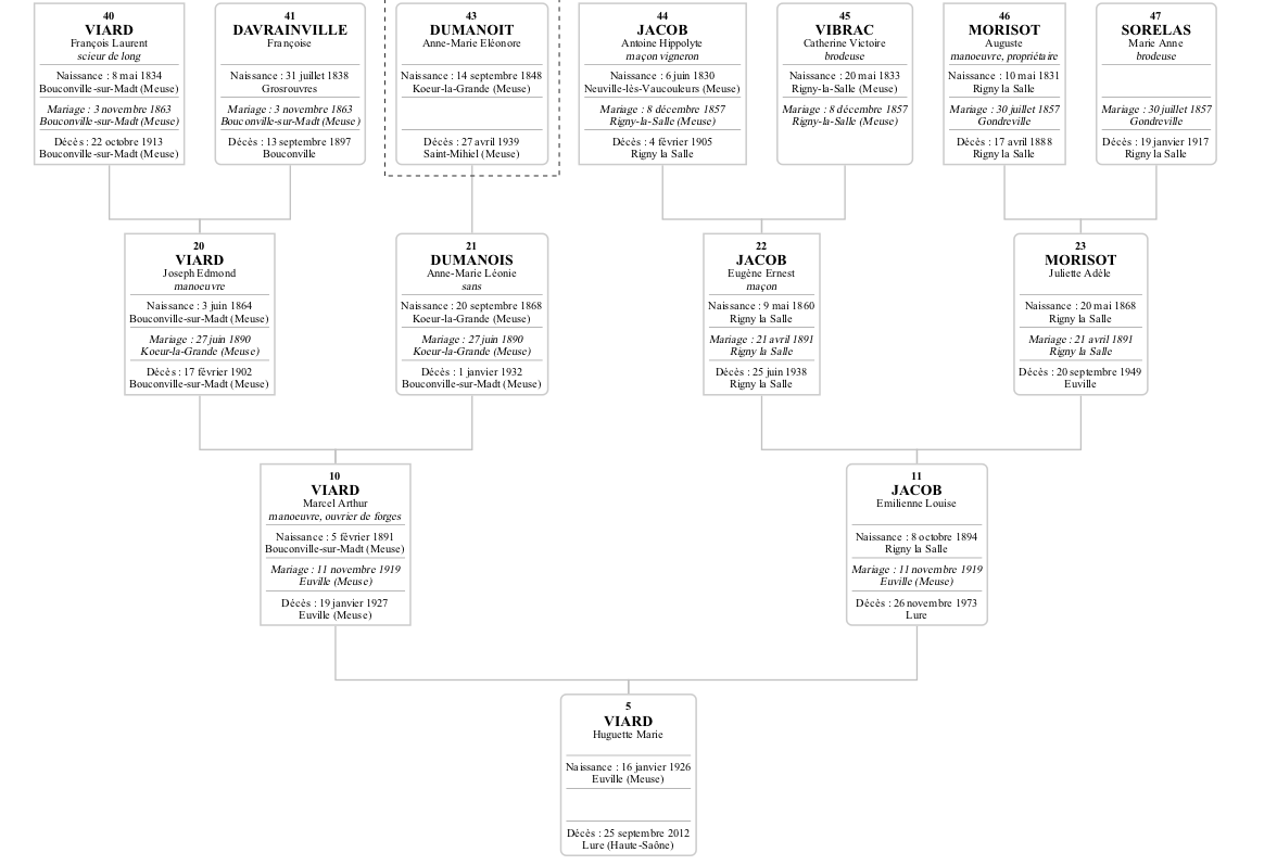 Son petit-fils, mon arrière grand-père, Marcel VIARD, est également déjà décédé le 19 janvier 1927 à Euville, laissant veuve mon arrière grand-mère Emilienne JACOB et ses 2 enfants, Jean et Huguette (ma grand-mère), demeurant à Euville.