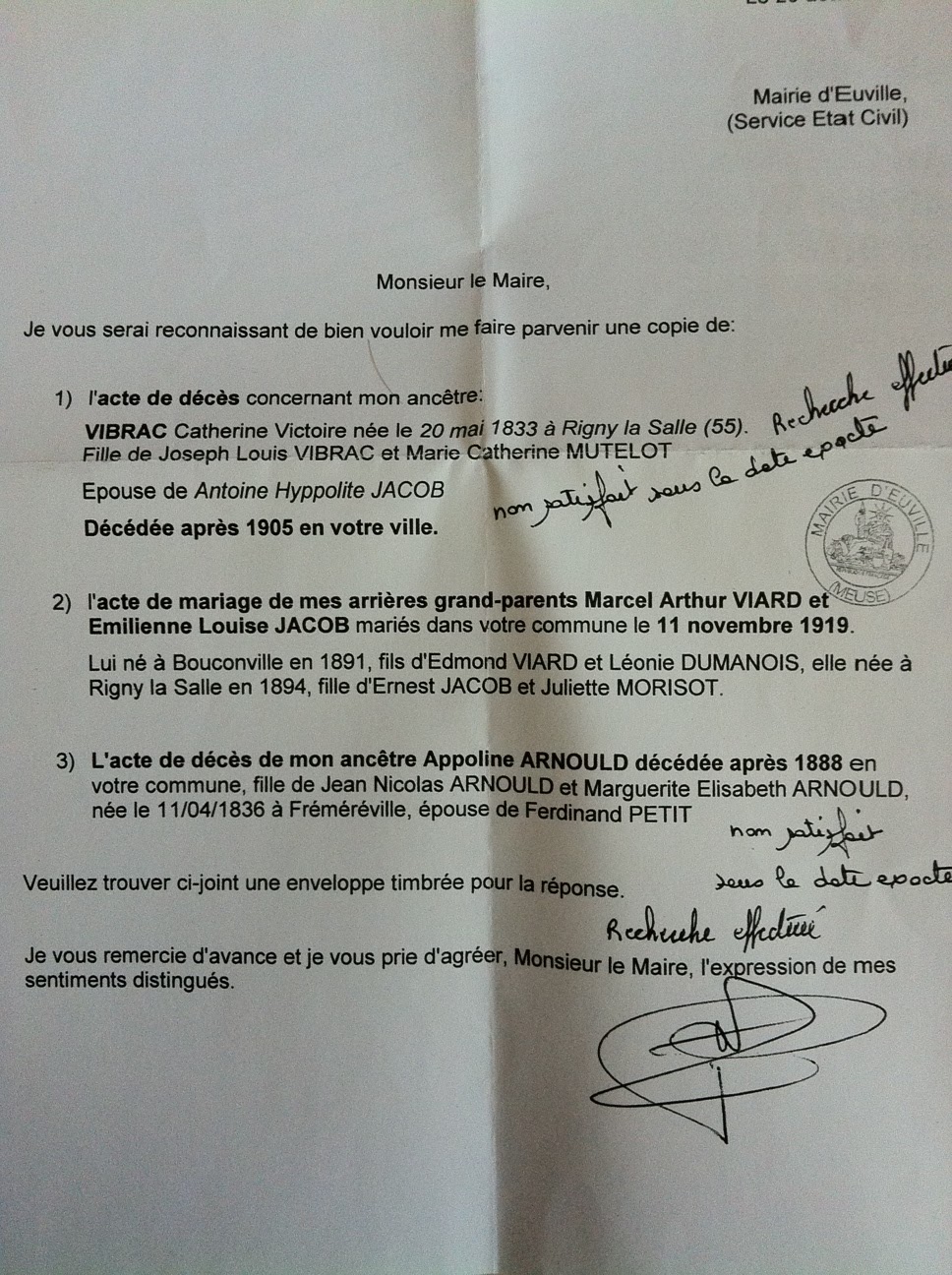Ne pouvant aller consulter en mairie directement, m'est venue l'idée : "mais pourquoi ne pas refaire la bonne vieille technique d'antan (:-)! = écrire à ces chers messieurs les maires pour obtenir une copie des actes d'état civil".