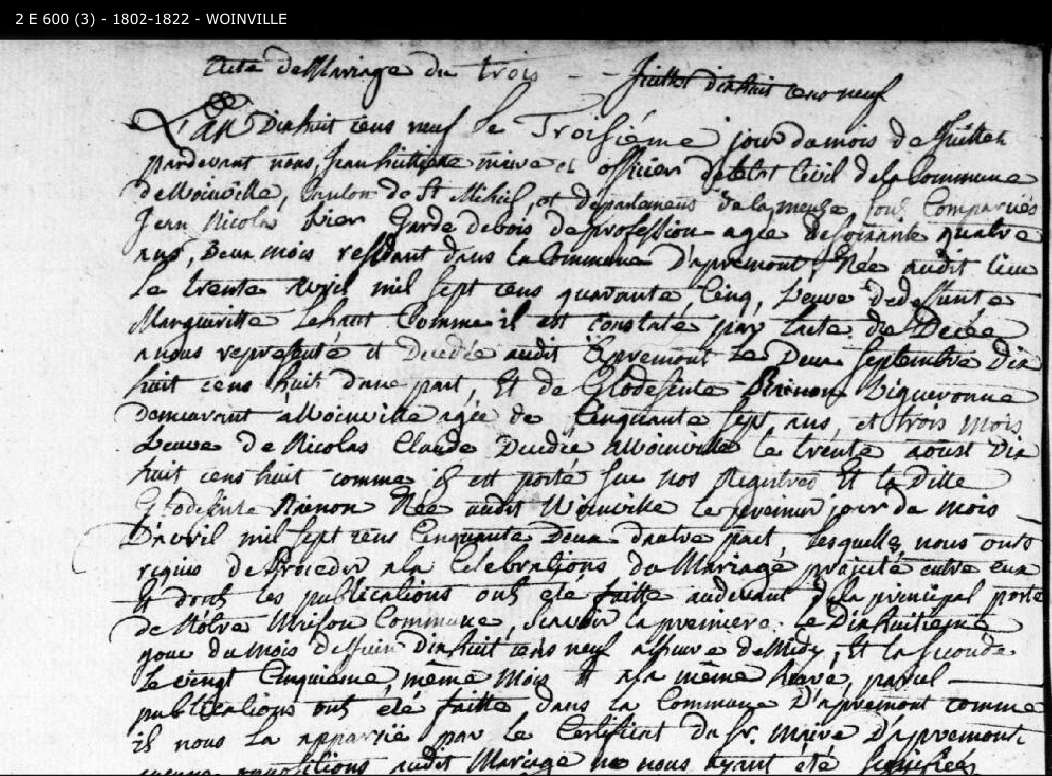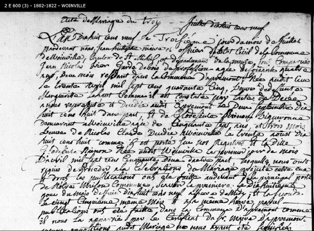 J'ai, de ce pas, été vérifié les registres de Woinville et ai trouvé l'acte de mariage le 3 juillet 1809.