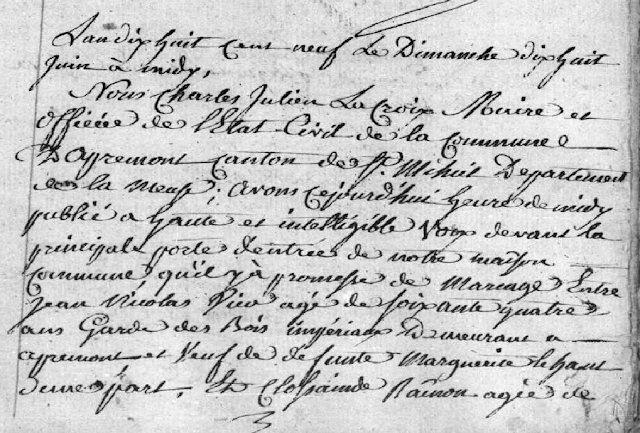 Cette première publication affirmait que Jean-Nicolas, alors âgé de 64 ans, allait se marier avec Clodesinte (ou Clossainde) RAINON originaire de Woinville, commune voisine.