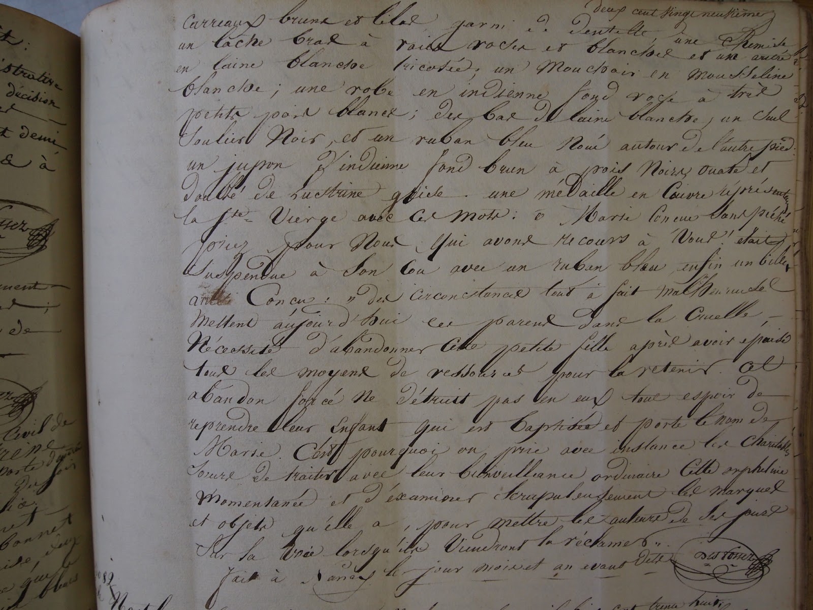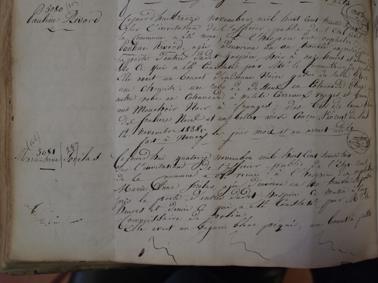 "L'an mil huit cent trente huit, le quatorze novembre , à onze heures du matin, par devant nous Jacques François Villot, adjoint au maire de la ville de Nancy, délégué pour remplir les fonctions d'officiers de l'Etat Civil en l'hôtel de ville, est comparu le sieur Jean Claude Martin, commissaire de police en cette ville, y demeurant, lequel nous a déclaré que cejourd'hui à cinq heures et demie du matin, d'après l'avis qui lui a été donné qu'un enfant était apposé près de la porte d'entrée de l'hospice des orphelins de cette ville, il s'y est transporté et a trouvé le dit enfant qu'il nous a présenté, enveloppé d'un jupon d'indienne fond brun, à pois noirs, ouaté, et doublé de laine grise, d'un (------), à raies roses et blanches, d'un autre en laine blanche........., d'une robe en indienne, fond rose, à petits pois blancs, d'un mouchoir en mousseline blanche, et d'une chemise, la tête couverte d'un béguin blanc piqué, et d'un bonnet à petits carreaux bruns et lilas, garni de dentelle ; les pieds chaussés d'une paire de bas de laine blanche, et d'un seul soulier noir, à l'autre pied, était noué un ruban bleu, après l'avoir visité avons reconnu qu'il était de sexe féminin, paraissait âgé d'un an, qu'il avait pour remarque, suspendu à son cou, avec un ruban bleu, une médaille en cuivre représentant la sainte Vierge, avec ces mots gravés: ô Marie, conçu sans pêché, prie pour nous, qui avons recours à vous; et un billet ainsi conçu : "Des circonstances tout à fait malheureuses mettant aujourd'hui ces parents dans la cruelle nécessité d'abandonner cette petite fille, après avoir épuisé tous les moyens de ressources pour la retenir. Cet abandon forcé ne détruit pas en eux tout espoir de reprendre leur enfant qui est baptisé et porte le nom de Marie. C'est pourquoi on prie avec instances les charitables soeurs de traiter avec leur bienveillance ordinaire cette orpheline momentanée et d'examiner soigneusement les marques et objets qu'elle a, pour mettre les auteurs de ses jours sur la voie, lorsqu'ils viendront la réclamer", et de suite l'avons inscrit sous les prénoms et nom de Marie Anne Sorélas, et ordonné qu'il soit reçu audit hospice, avons dressé acte en présence des sieurs Louis Gaspard Beaucourt, âgé de quarante ans, et Joseph Brêche, agé de vingt sept ans, tous deux professeurs de musique en cette ville, y domiciliés, et ont les comparants et témoins signés avec nous".