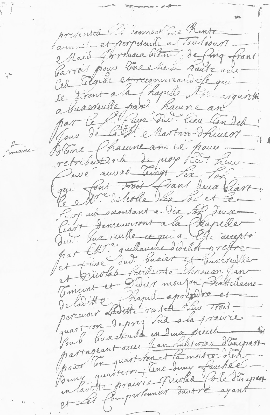 Ils donnent une Rente annuele et perpetuelle a Tousjours Mais irrevocablement de cinq frans barrois pour une messe haute avec Ces Vigille et recommandees qui se diront a la Chapelle S(ain)te margueritte a buxereulle parr chacune an par le Sr. Curé dud. lieu Un ded. Jour de la semaine St Martin dhiver dune chacune année