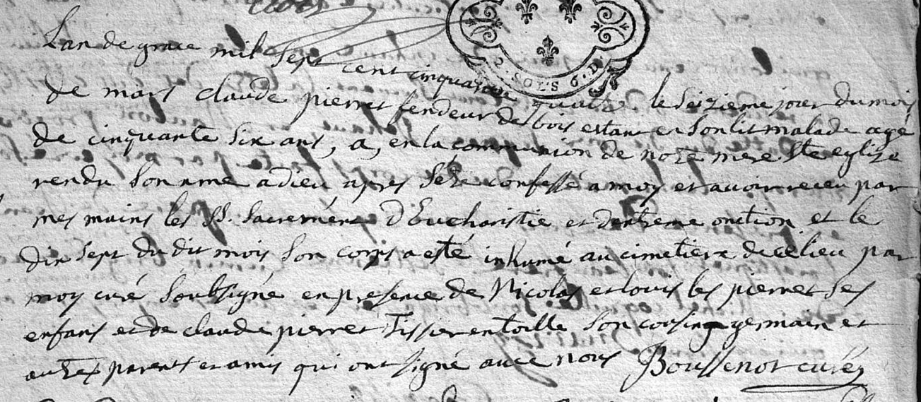 Le 16 mars 1754, Claude PIERRET est décédé, et le curé d'Eurville mentionne bien le métier de fendeur de bois. Il est d'ailleurs décédé dans son lit des suites d'une maladie.