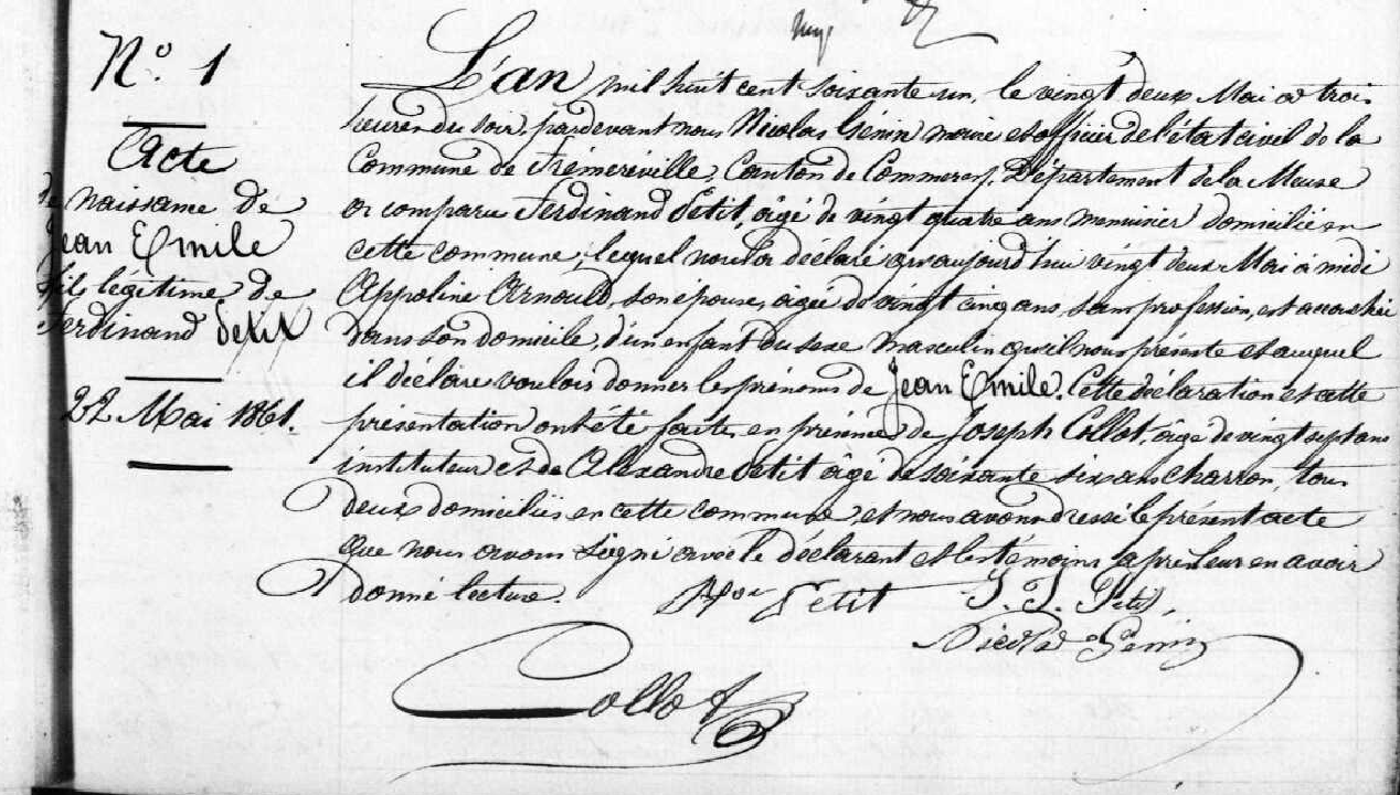 Commençons par Jean Emile PETIT, charron de profession, né le 22 mai 1861 à Fréméréville sous les côtes (Meuse), fils de Ferdinand PETIT et Appoline ARNOULD