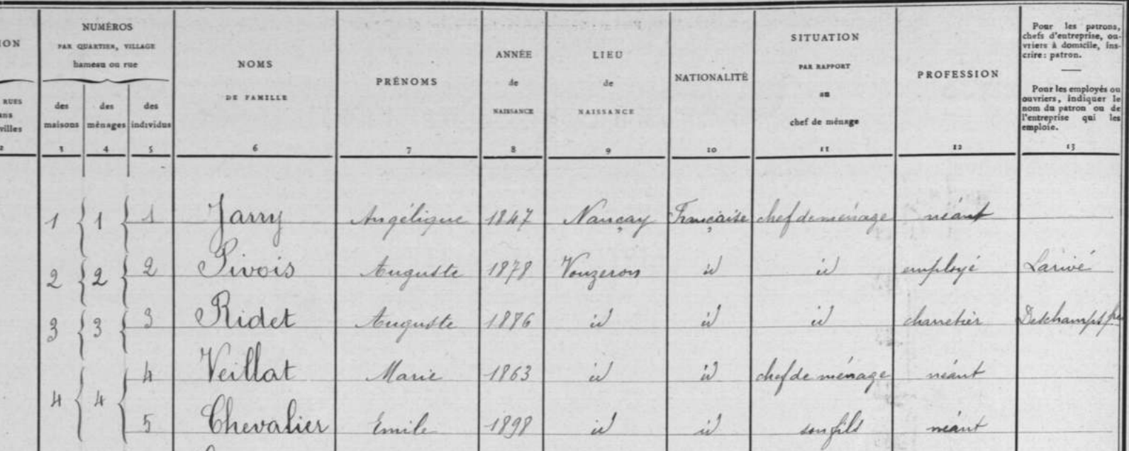 Le recensement de 1906 m'éclaire sur leur situation puisqu'ils sont indiqués comme résidant au bourg de Vouzeron.