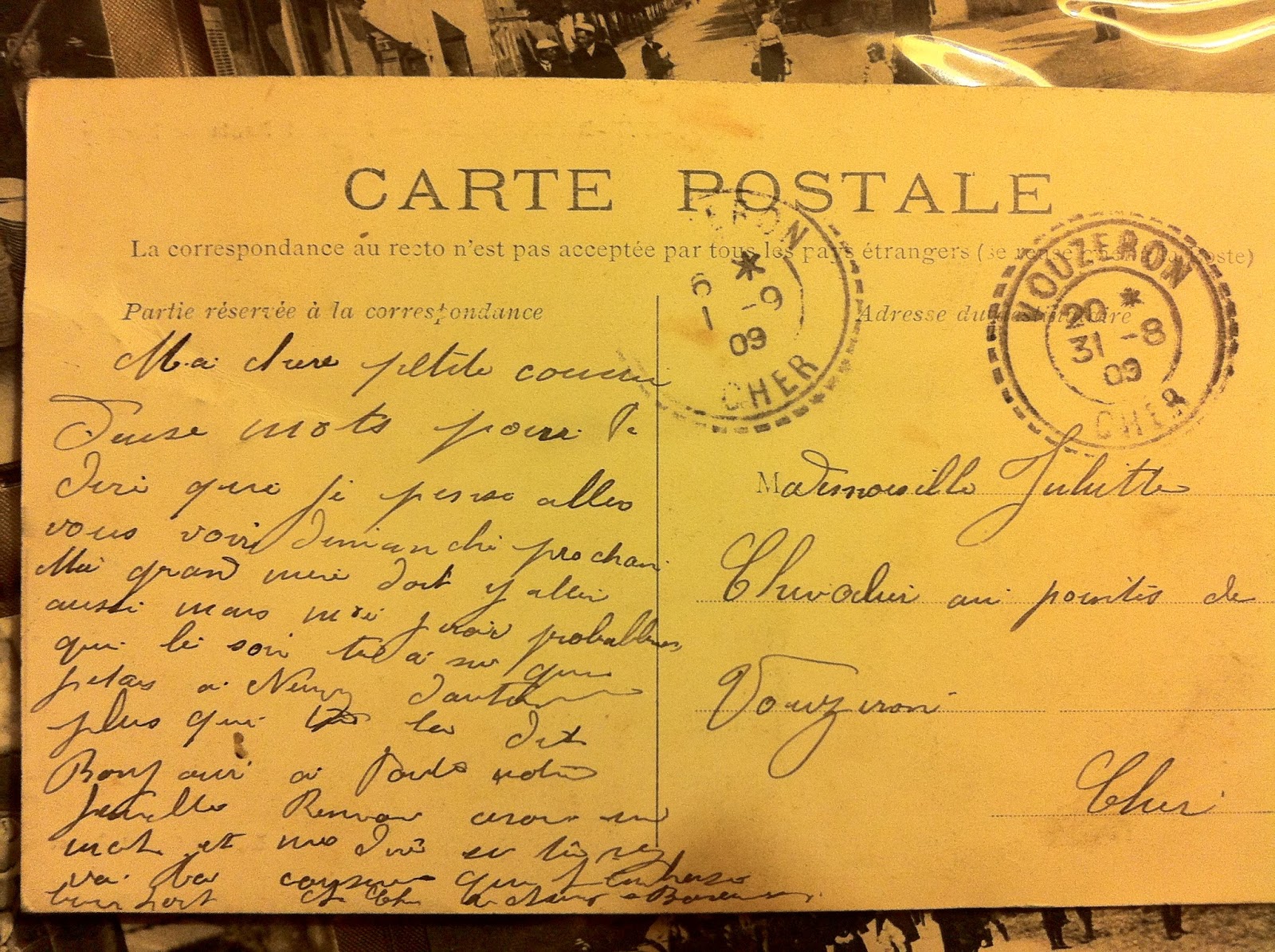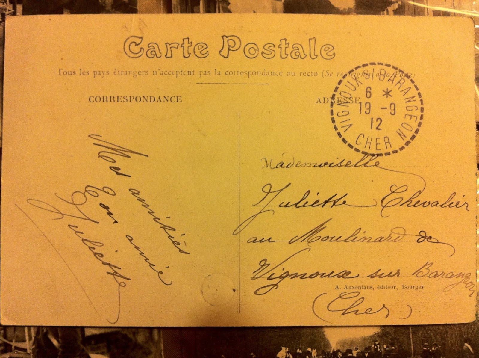 Une carte postale du 19 septembre 1912 atteste de la présence de Juliette dans ce lieu-dit de Vignoux sur Barangeon, commune voisine de Saint-Laurent.
