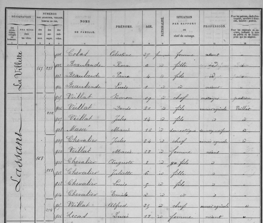 Si on regarde attentivement le recensement effectué dans la commune en 1901, la famille Chevalier-Veillat réside toujours dans le même hameau de Lascent avec les grand-parents.