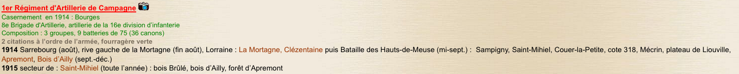 J'ai vérifié sur le site chtimiste qui contient les parcours et des photos des différents régiments ayant participé à la première guerre, mais curieusement, les endroits évoqués ne correspondent pas avec ceux évoqués par mon arrière grand-père! Le 1er régiment d'artillerie est indiqué comme étant arrivé à Sarrebourg et basé ensuite en Lorraine jusqu'en 1915.