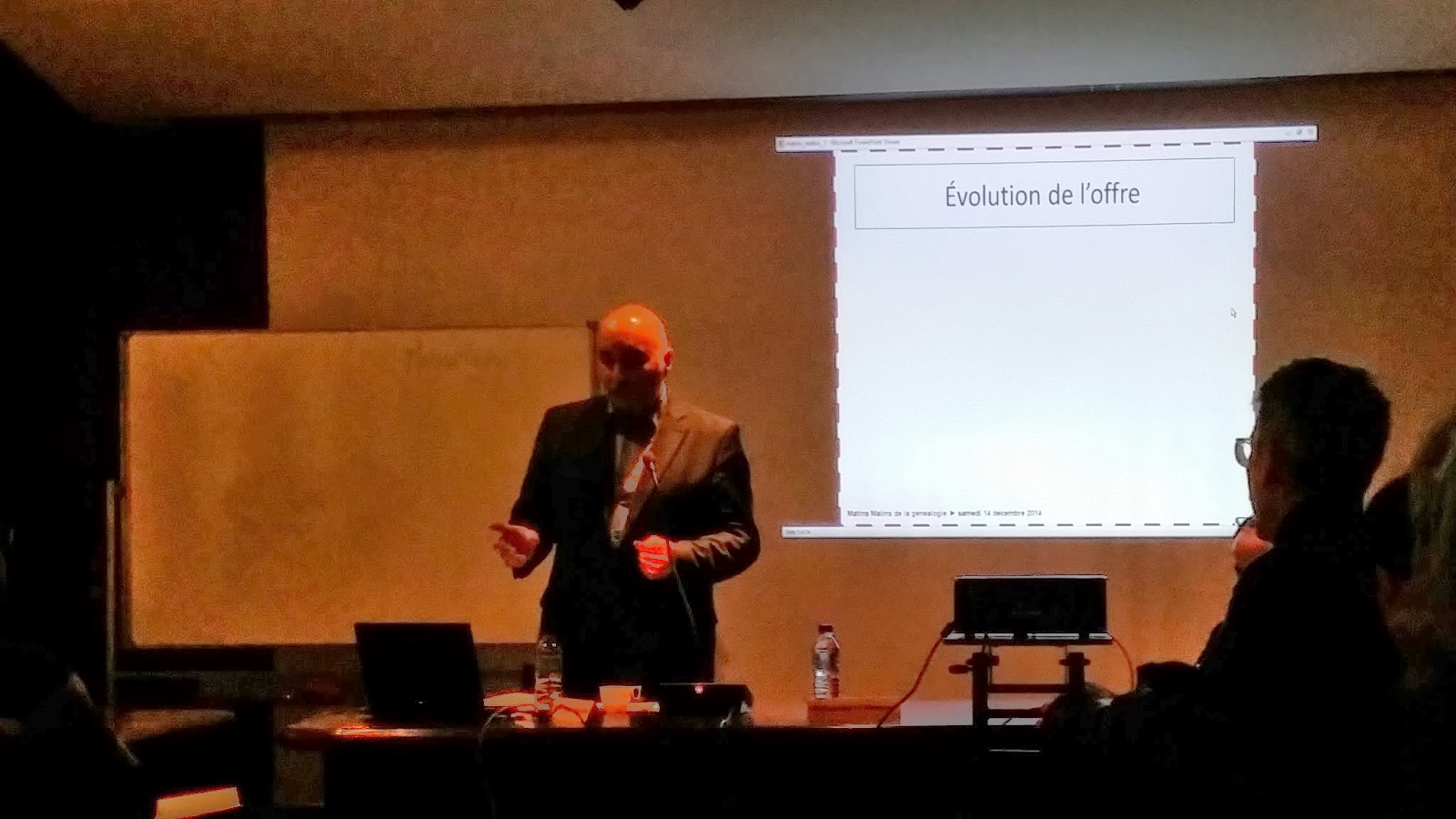 Les intervenants, Pierre-Valéry Archassal et Guillaume de Morant, bien connus des lecteurs de la Revue Française de Généalogie, nous ont présenté l'évolution de la généalogie sur Internet, et les différents types de visualiseurs d'archives en ligne, mais aussi les trucs et astuces. Cette présentation a été ponctuée de nombreux échanges également très intéressants. +Sophie Boudarel (La Gazette des Ancêtres) était également présente pour gérer les échanges, ainsi que Benoît de Maigret, Directeur partenariats et e.commerce chez GeneaNet.