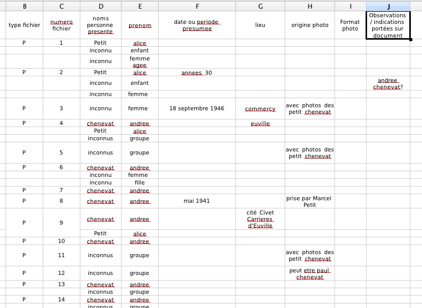 Il sera intégré dans un tableau Excel avec plusieurs rubriques et des filtres destinés à retrouver en un clin d’œil l'ensemble des photos relatives à un ancêtre ou à une famille, mais aussi et surtout toutes les informations relatives à une photo bien précise.
