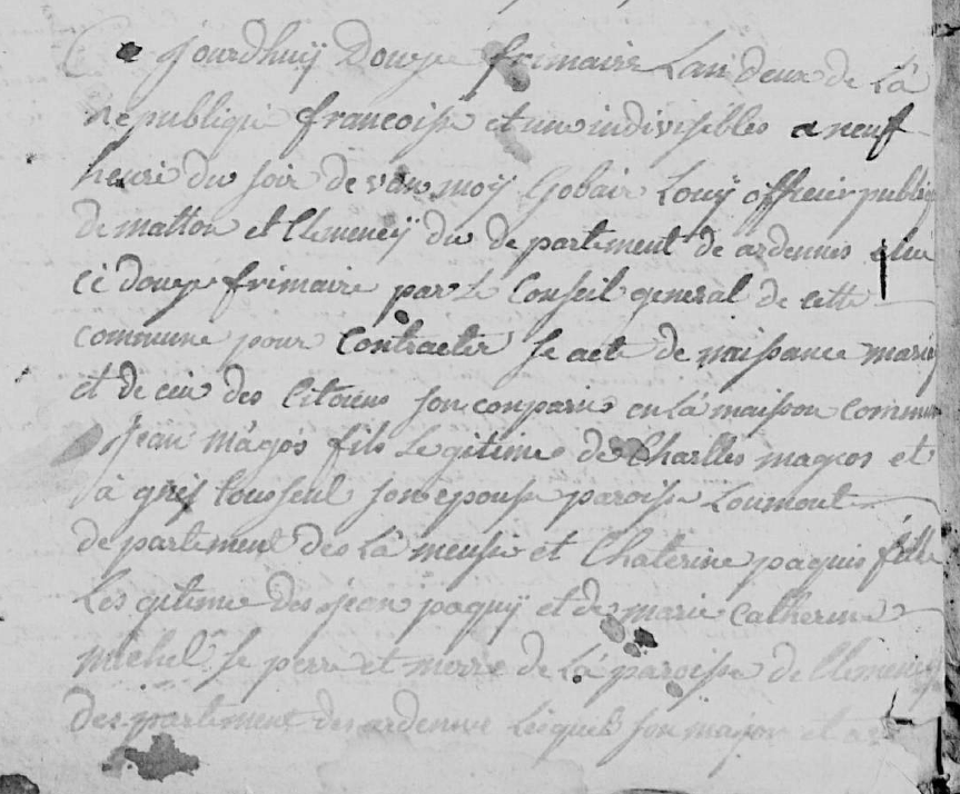 Grâce aux archives en ligne du département des Ardennes, j'ai pu y découvrir dans la dite commune de Matton, le mariage de mes aïeux, Jean et Catherine. Mariage, difficile à trouver vu l'orthographe des patronymes. Je vous laisse le soin de lire leur acte de mariage ici-bas. Mais souvenons nous qu'il s'agit de la période révolutionnaire et que la plupart des officiers d'état civil remplaçant les prêtres, n'étaient pas très à l'aise avec la langue française.