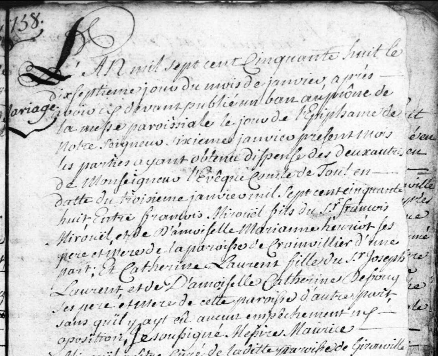 Mon ancêtre François Mirouel s'est fiancé le 16 janvier 1758 à Catherine Laurent devant le prêtre de Gironville-sous-les-côtes, petit village de la Meuse, connu pour son église fortifiée.