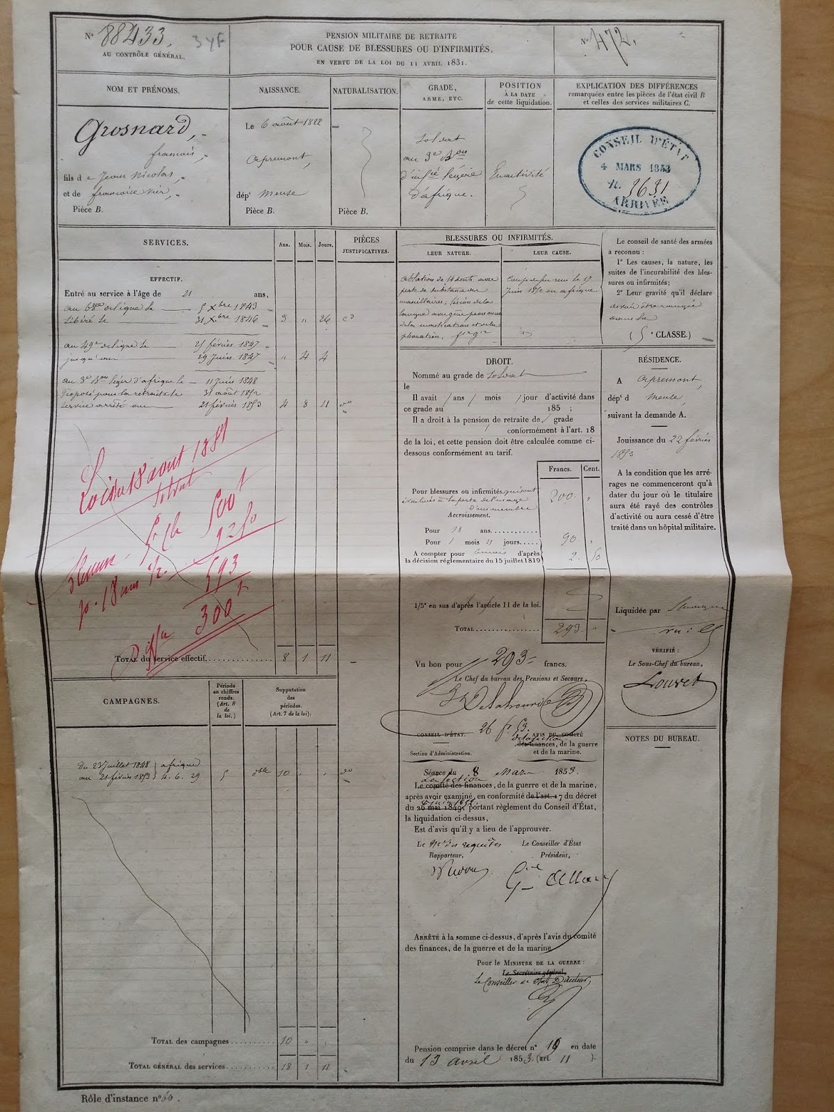 En mai dernier, en recherchant sur le site internet du Service Historique de la Défense, je trouve la sous-série 3 Yf sur les dossiers de pensions militaires, en me disant que si mon ancêtre a été militaire, et qu'il a été blessé, il a forcément eu un dossier de pension.