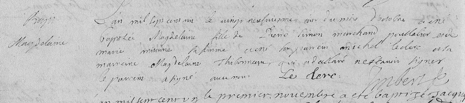 baptisé Magdelaine fille de Pierre Simon marchand ______ et de