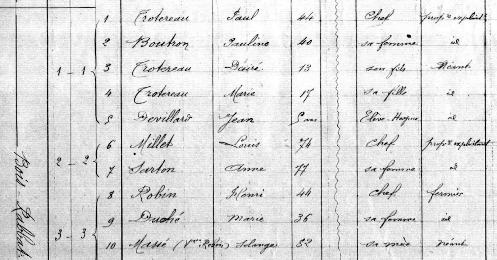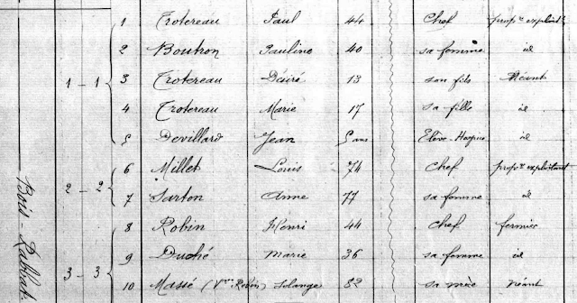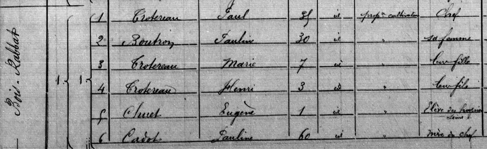 Sa belle-mère, avant elle, Pauline BOUTRON, épouse TROTEREAU, a pris en charge deux enfants également. C'est ce que j'ai découvert grâce aux recensements de la commune numérisés et mis en ligne sur le site des Archives départementales du Loir-et-Cher.