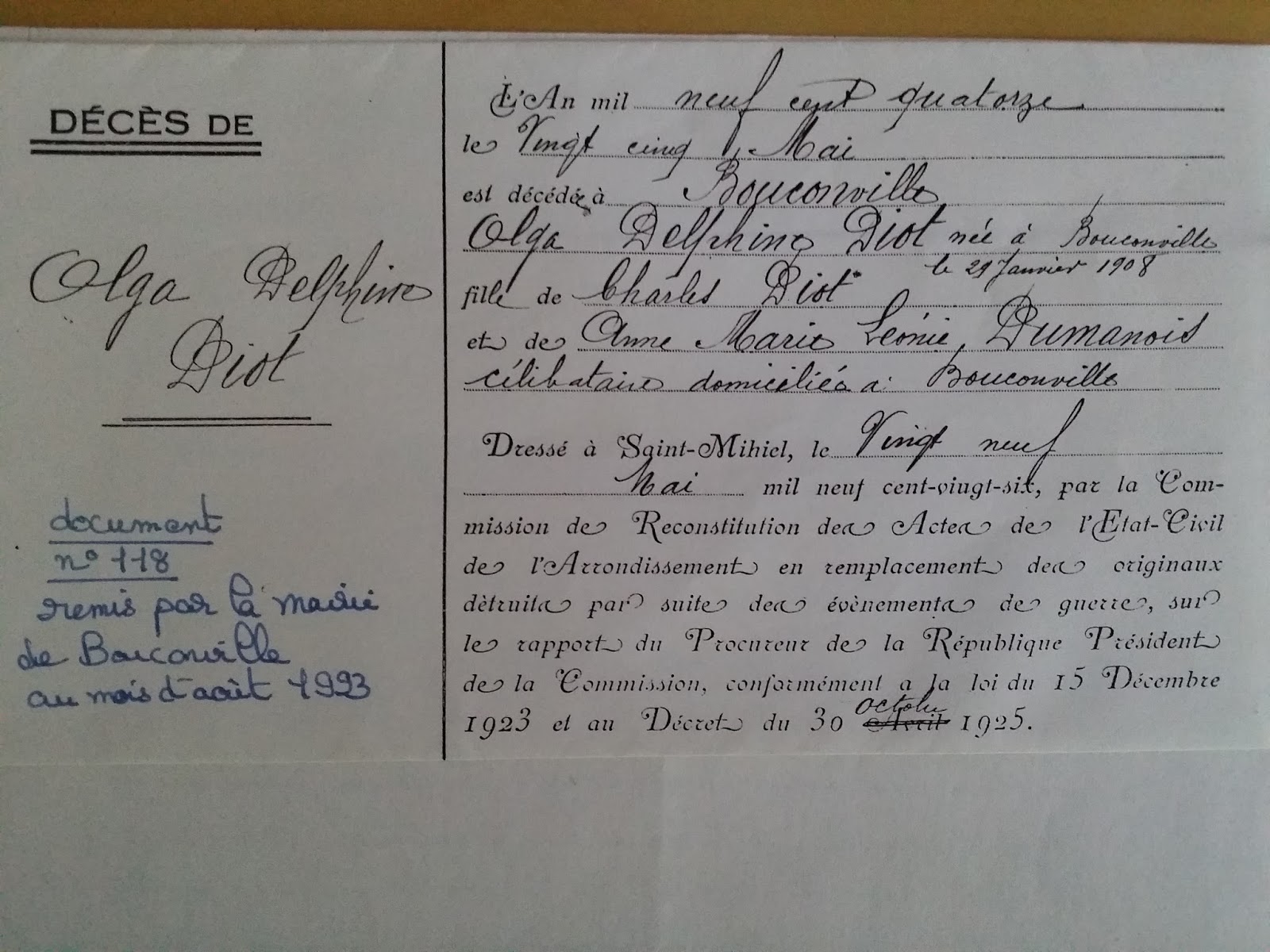 Olga Delphine DIOT est née à Bouconville le 30 janvier 1908: