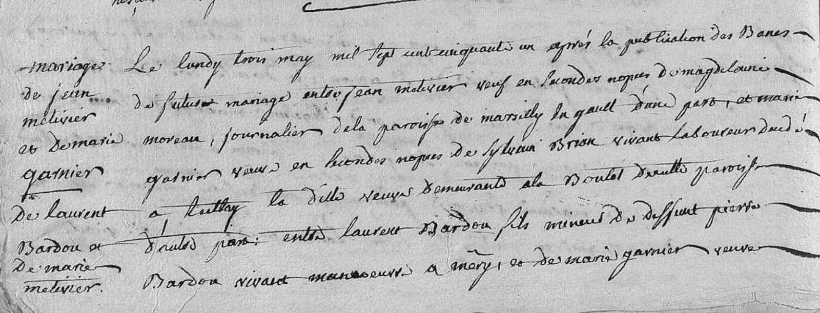 Avant l'âge de 15 ans, elle épouse son premier mari, Pierre BARDOU (ou Bardon) le 16 juin 1722 à Méry-sur-Cher.