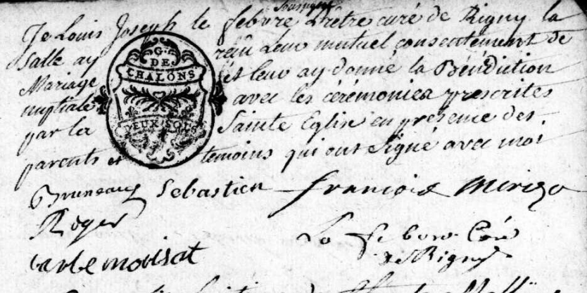 Le mardi 15 avril 1760, se sont mariés, Etienne Fillie et Barbe Morizot, dans la paroisse de Rigny-la-Salle, proche de Vaucouleurs, dans l'actuel département de la Meuse.