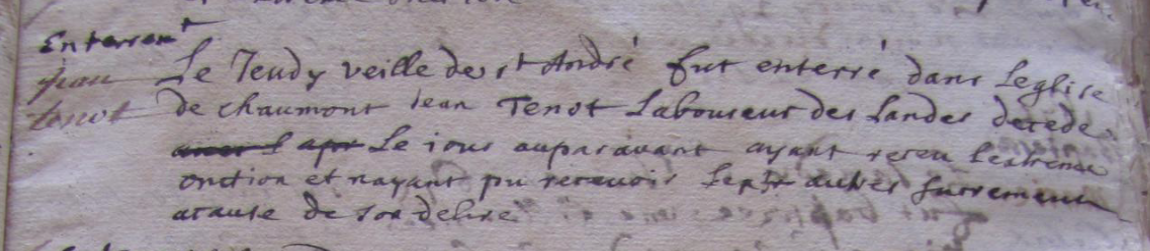 Sur la dernière d'une a page du registre d'une année (1698), le curé fait état du guet-apens subit par le sieur de la Neuville. Voyez plutôt ; les aides de retranscription sont les bienvenues