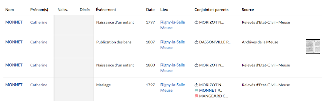 Et donc un petit cadeau en cette période de fêtes, Catherine Monnet s'est remariée le 30 mars 1807 à Belfort (Territoire de Belfort) avec Joseph DASSOUVILLE !!!