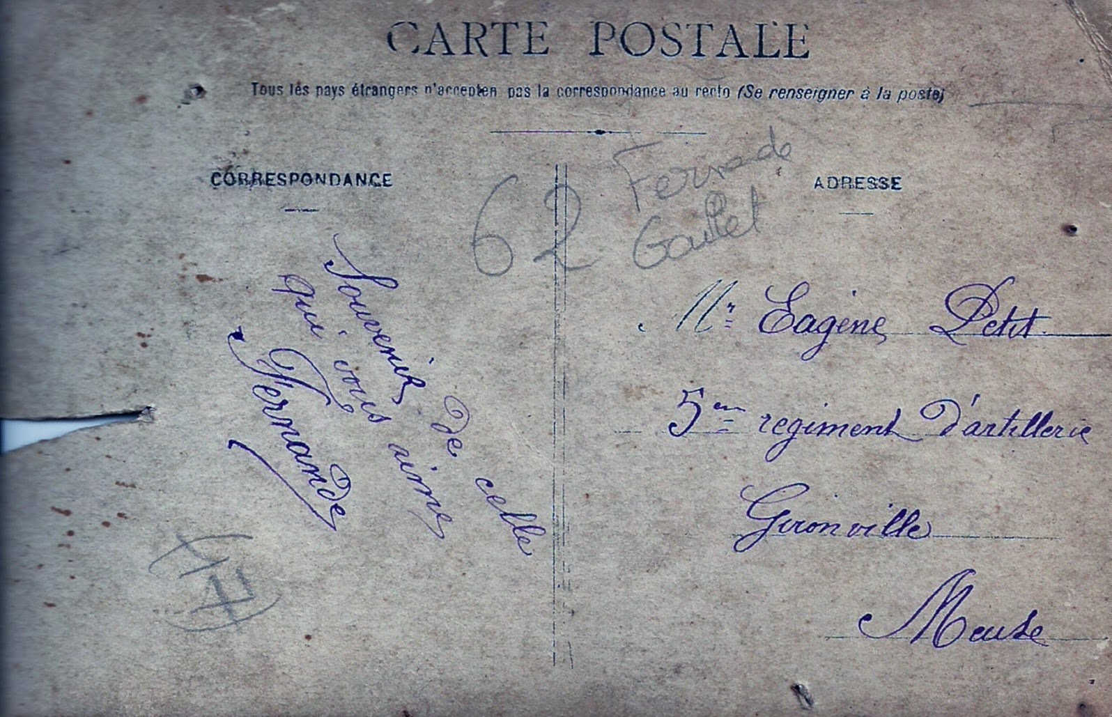 Alors que mon grand-père est au front entre Saint Mihiel et Commercy, dans le fort de Gironville sous les côtes, Fernande lui envoie ce mot, ce réconfort: